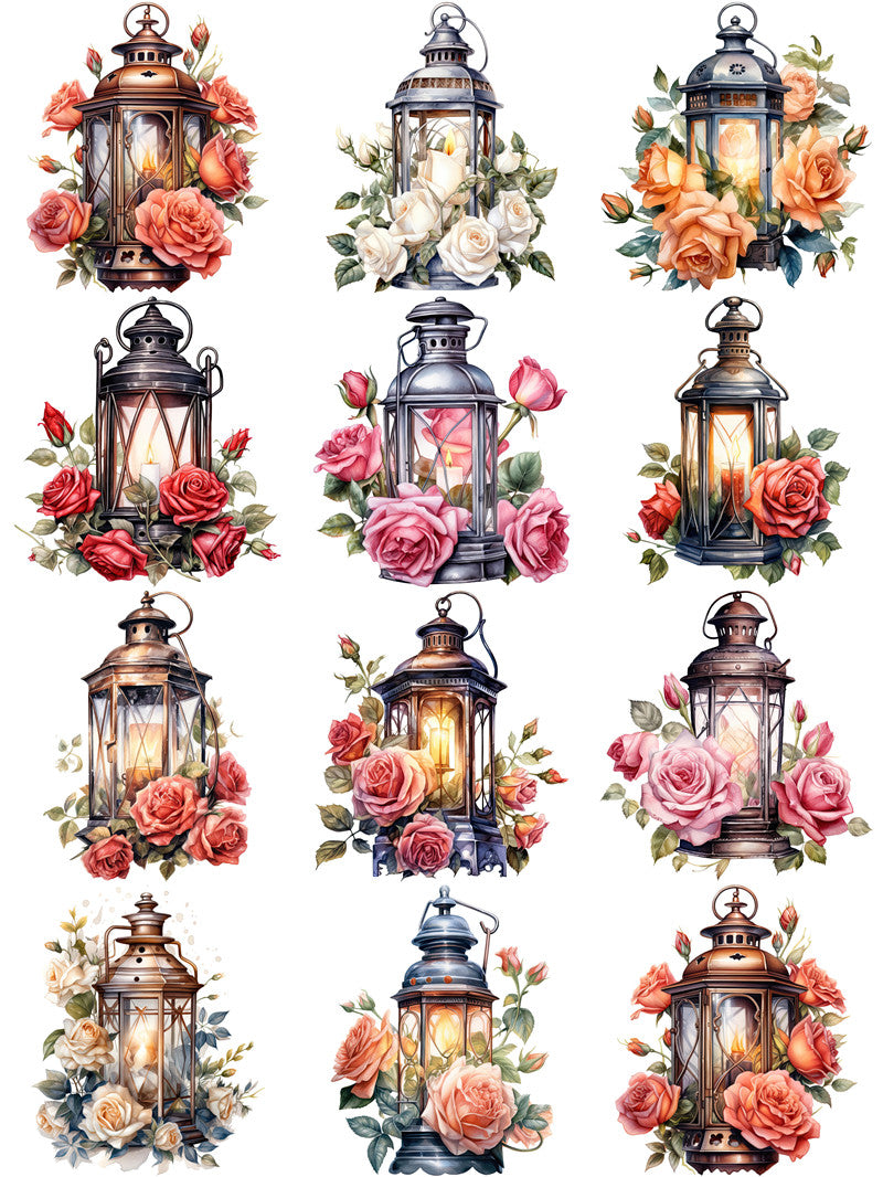 12 x Vintage-Aufkleber mit Rosenlichtern.